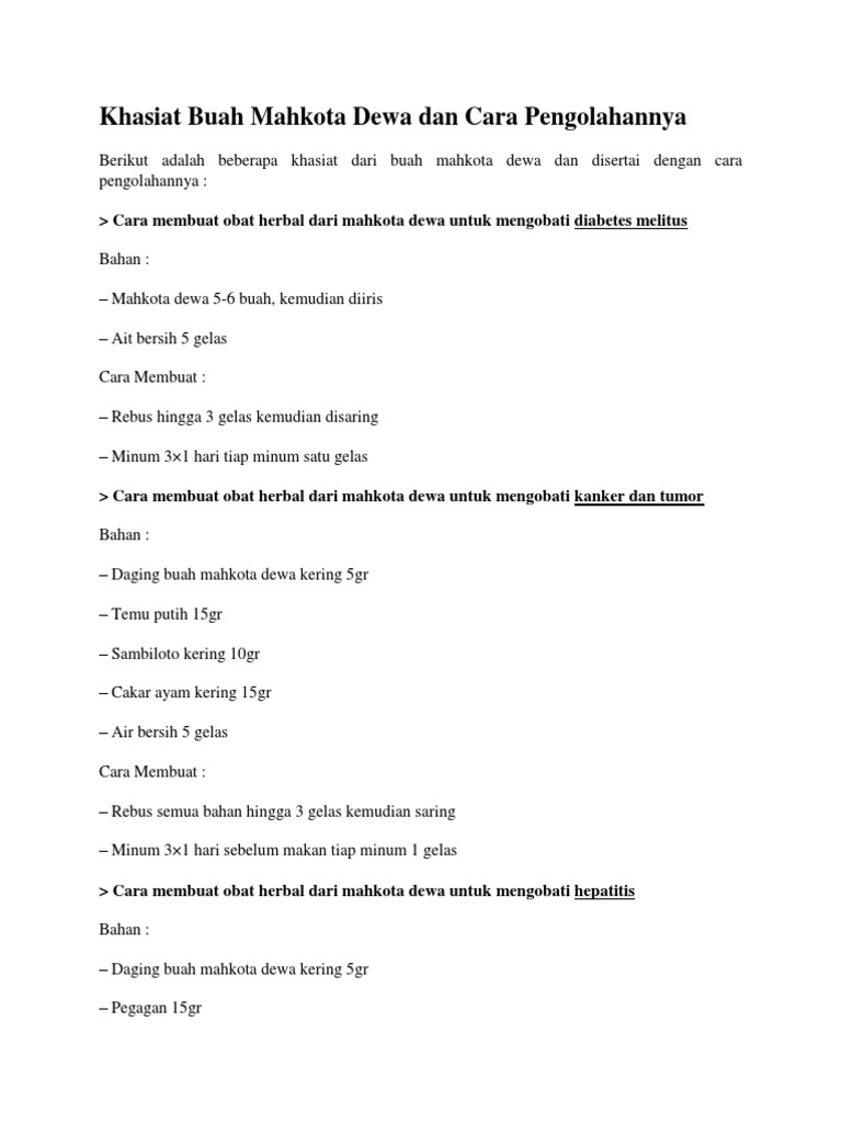 Lalu apa saja manfaat dan khasiat buah mahkota dewa ini, berikut ini informasinya. Cara mengolah mahkota dewa bagia dewa bagian n batang cukup sederhana. Sekilas info tentang mahkota dewa. Buahnya memiliki diameter maksimal 5 cm. Untuk cara mengolah buah mahkota dewa yang disarankan adalah dikeringkan terlebih dahulu.