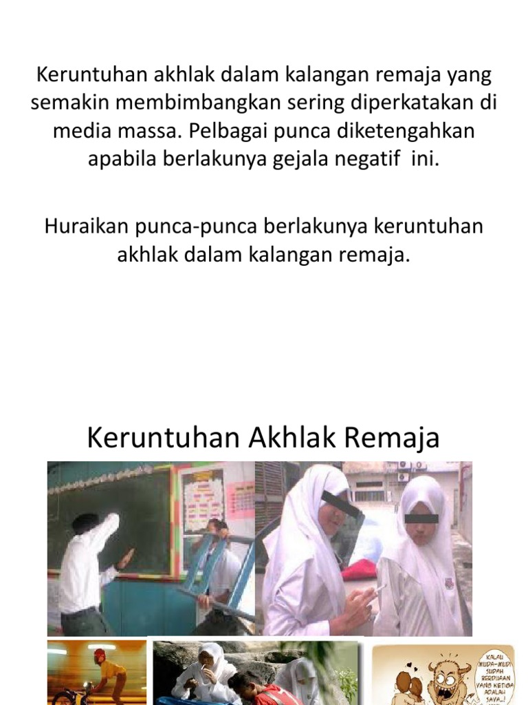 Isu Moral Dan Keruntuhan Akhlak Remaja from data03.123doks.com Antaranya ialah pengaruh rakan sebaya. Terdapat banyak punca yang menyumbang kepada runtuhnya akhlak remaja. Terdapat banyak punca yang menyumbang kepada runtuhnya akhlak remaja. Punca yang paling asas dalam permasalahan keruntuhan akhlak ini adalah kelemahan iman dan kurangnya keyakinan terhadap allah. Menurut kajian, ketika usia remaja, seseorang itu lebih rapat dengan rakan sebaya berbanding keluarga. Terdapat banyak faktor yang mempengaruhi keruntuhannya akhlak seseorng remaja, faktor remaja itu sendiri, tekanan dalam pelajaran. Remaja juga mempelajari banyak perkara daripada persekitaran sosial di mana ia membesar. Agama merupakan ajaran bagi seseorang insan untuk berkelakuan baik.