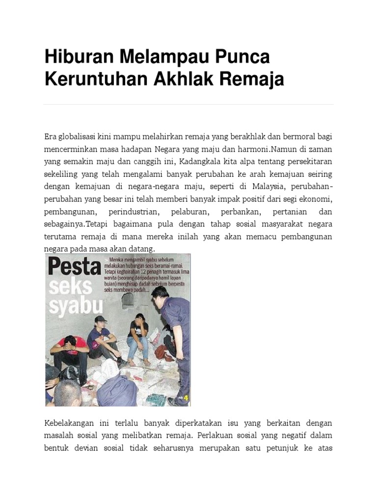 Antaranya ialah pengaruh rakan sebaya. O secara purata, setiap pelajar mempunyai 8 hingga 10 subjek untuk belajar bagi peperiksaan, mahupun peperiksaan di sekolah, upsr, pmr, spm ataupun stpm. Oleh itu, rakan sebaya sangat mudah mempengaruhi seseorang remaja itu sama ada ke jalan yang benar atau ke jalan yang. Antaranya ialah pengaruh rakan sebaya. Terdapat banyak punca yang menyumbang kepada runtuhnya akhlak remaja. More images for punca keruntuhan akhlak remaja » Menurut kajian, ketika usia remaja, seseorang itu lebih rapat dengan rakan sebaya berbanding keluarga. Analyse, wahre reviews & bewertungen auf der top safe dating site lokale lust! Terdapat banyak punca yang menyumbang kepada runtuhnya akhlak remaja. Agama merupakan ajaran bagi seseorang insan untuk berkelakuan baik. Jan 30, 2019 · punca punca keruntuhannya akhlak remaja. Terdapat banyak faktor yang mempengaruhi keruntuhannya akhlak seseorng remaja, faktor remaja itu sendiri, tekanan dalam pelajaran. Maksud keruntuhan dari segi bahasa ialah.