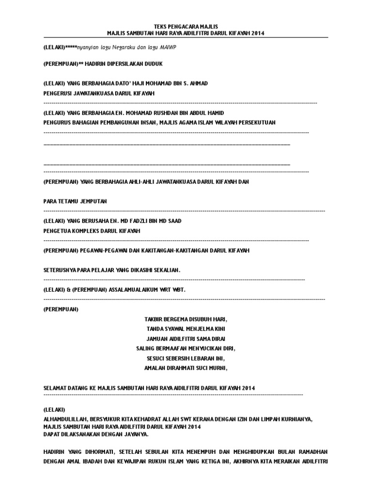 Majlis mengucapkan ribuan terima kasih tuan pengetua smk dato jaafar atas ucapan tuan sebentar tadi. Terima kasih diucapkan kepada semua yang telah memberikan kerjasama. siti ruhana mengumumkan ketibaan yang berbahagia , en. Ulangtahun kemerdekaan malaysia akan tiba beberapa hari je lagi. Skrip pengacara majlis sambutan hari raya 2012.